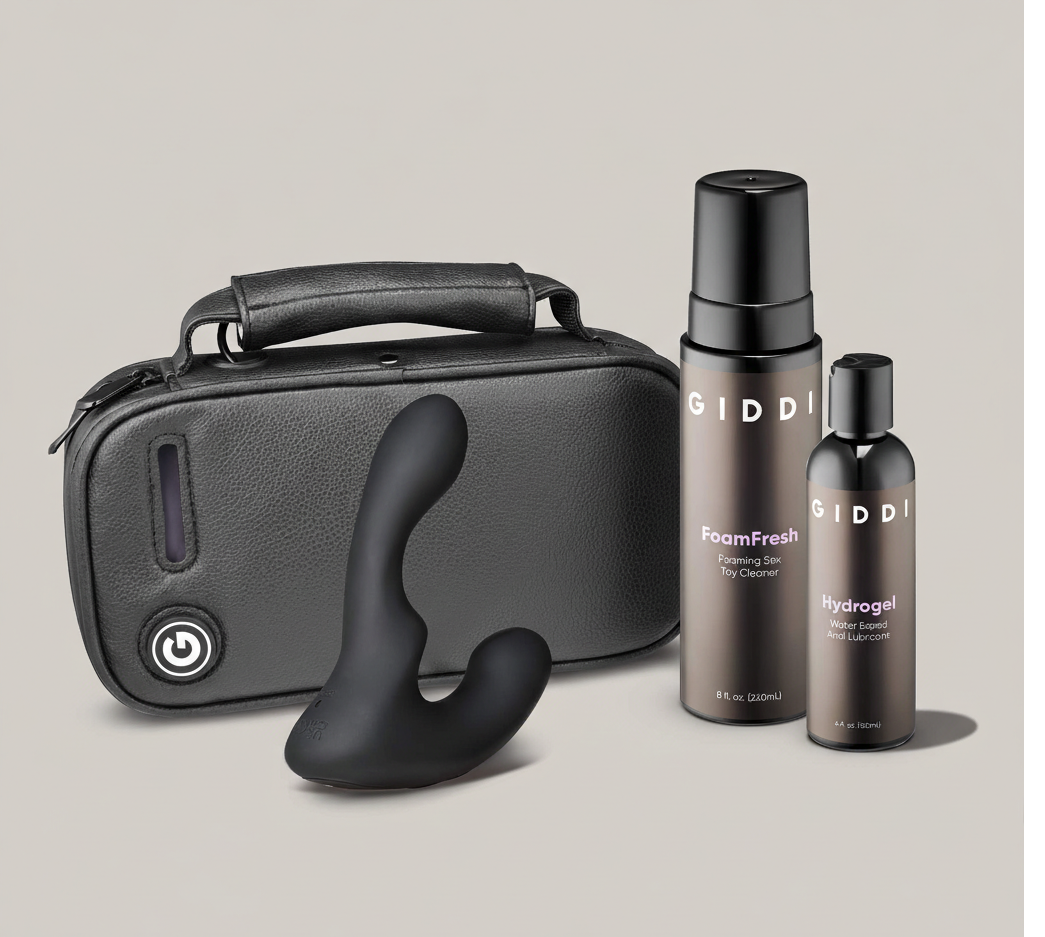 Giddi product set including a black silicone toy, FoamFresh cleaner, and Hydrogel lubricant on a beige background.
